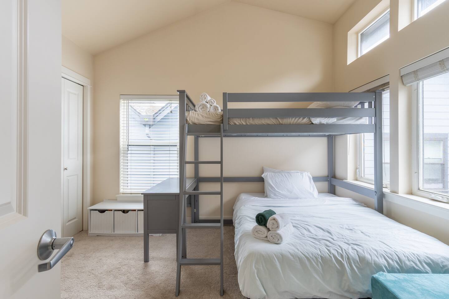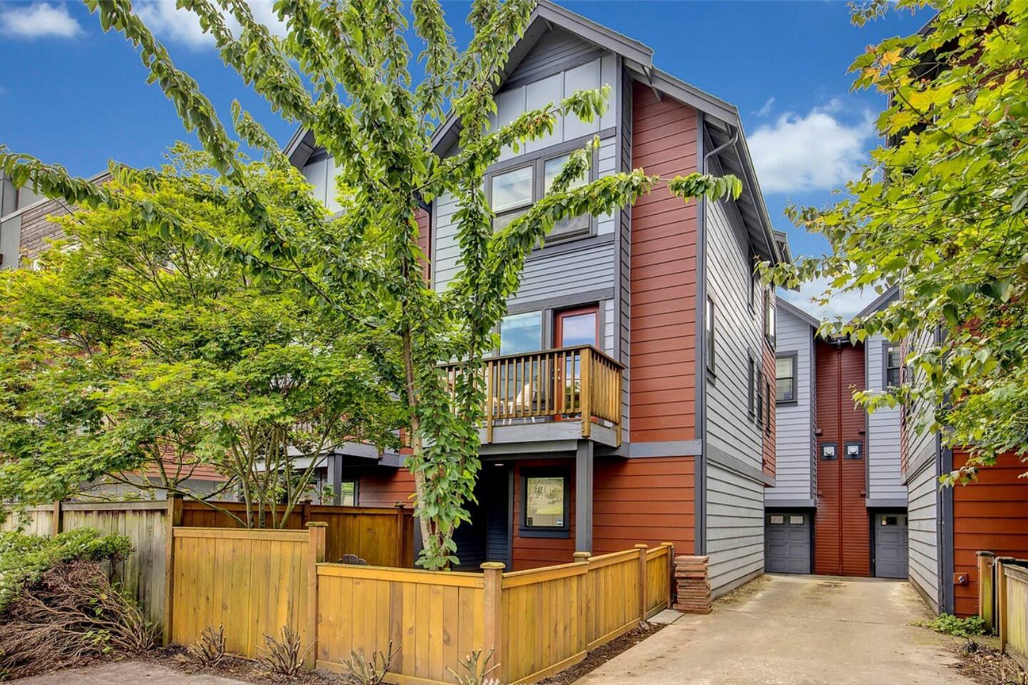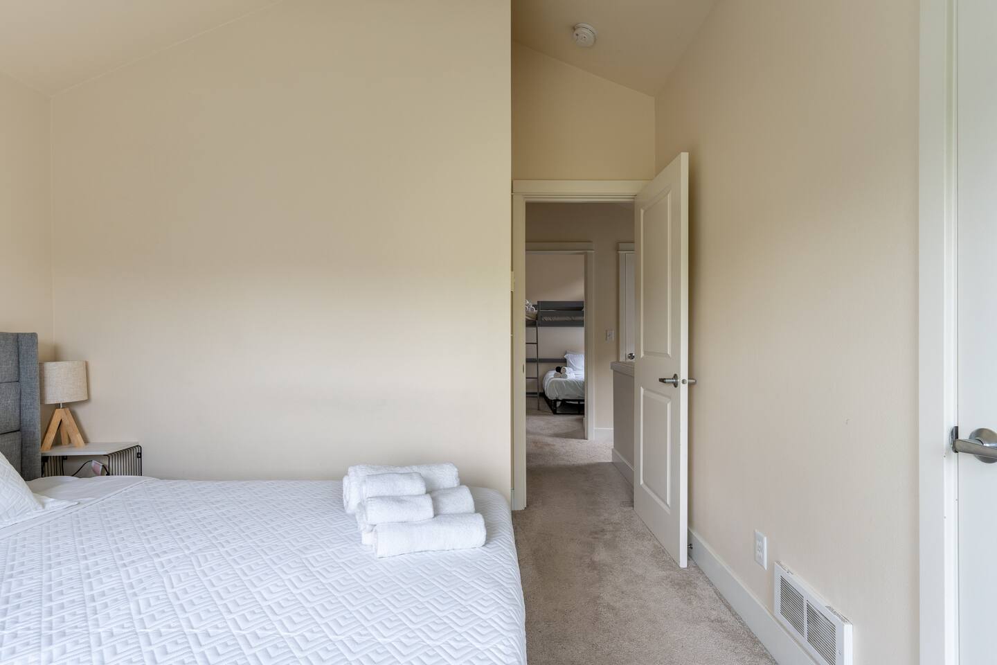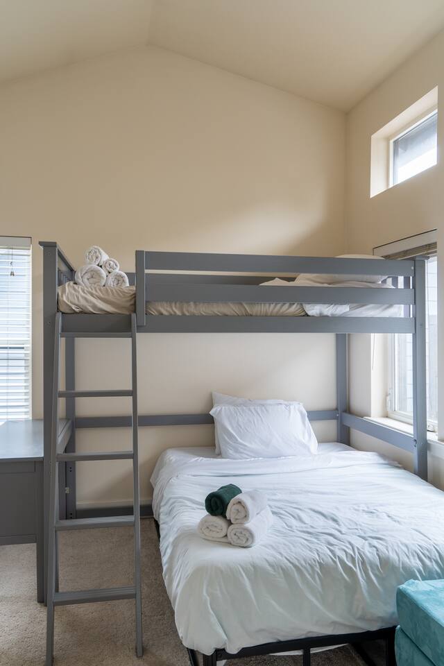 Our townhome has 2 bedrooms and 1.5 bathrooms. The master bedroom is the smallest room with a king bed. The second bedroom is larger with a full bunk bed and a full bed underneath. We have a small deck with a table and chairs as well as a small, fully enclosed yard. *The stairs from the entryway that lead to the main floor are stained. Weve had them shampoo'd and all kinds of deep cleaned. It has been like this since we bought it - its not "dirty".