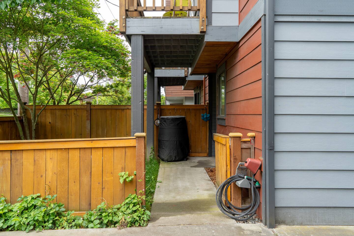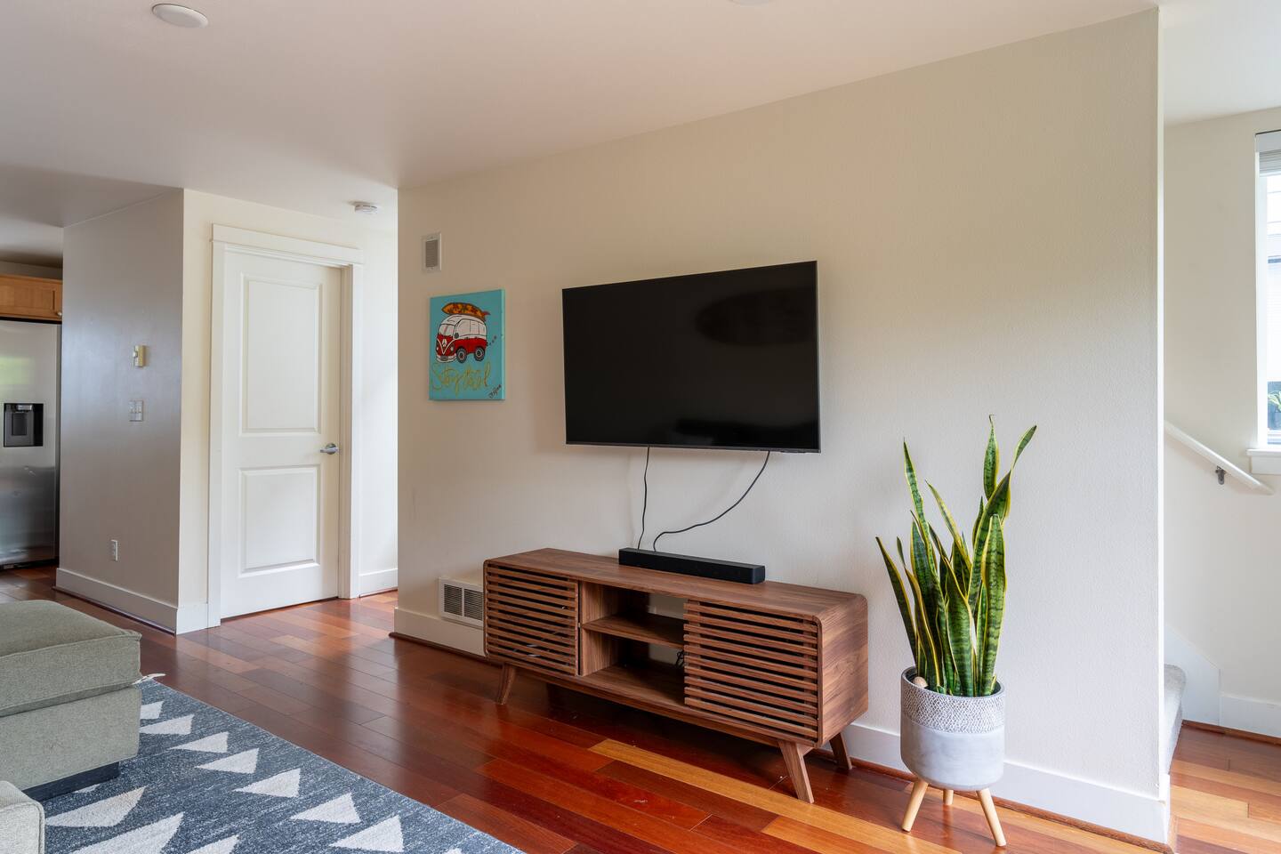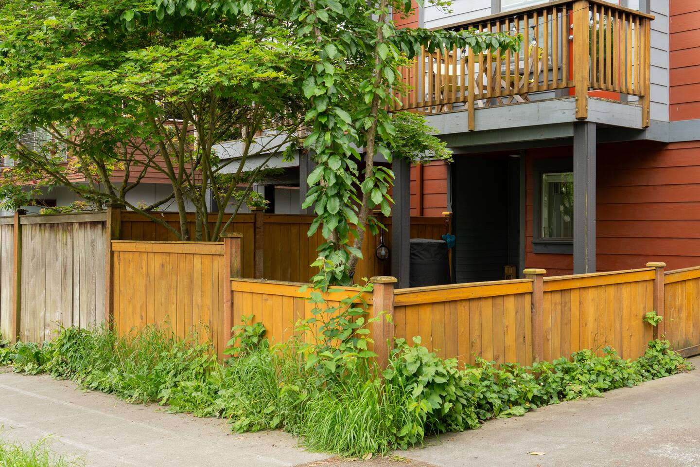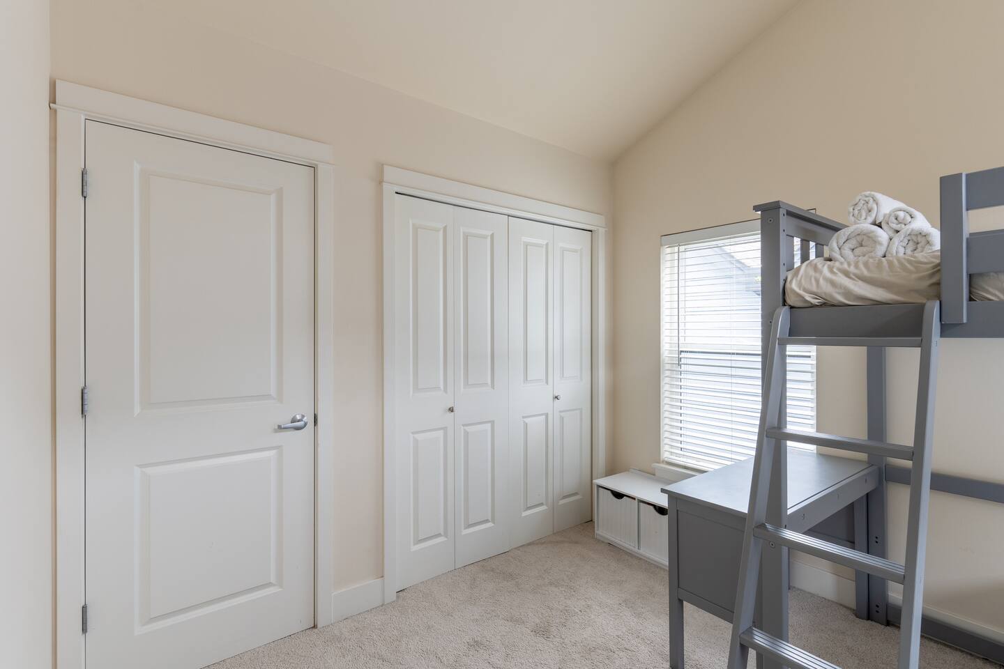 Our townhome has 2 bedrooms and 1.5 bathrooms. The master bedroom is the smallest room with a king bed. The second bedroom is larger with a full bunk bed and a full bed underneath. We have a small deck with a table and chairs as well as a small, fully enclosed yard. *The stairs from the entryway that lead to the main floor are stained. Weve had them shampoo'd and all kinds of deep cleaned. It has been like this since we bought it - its not "dirty".