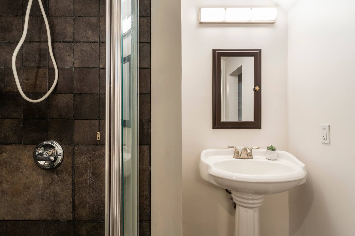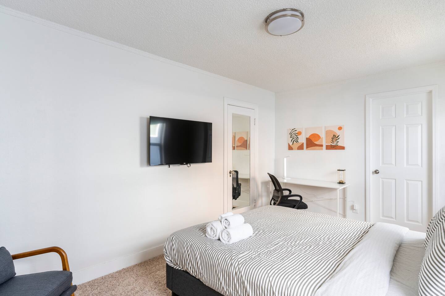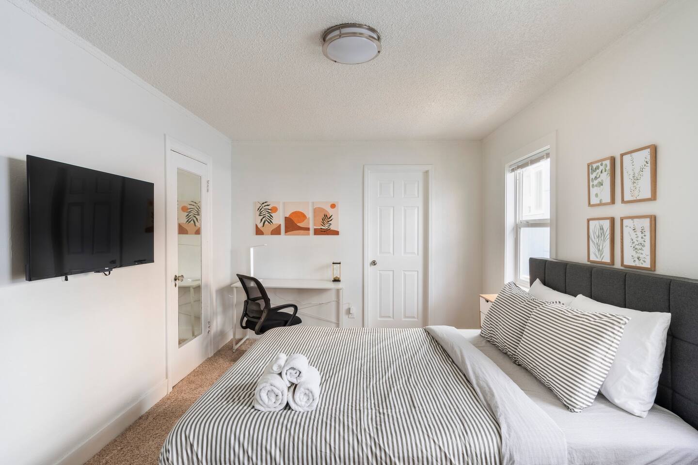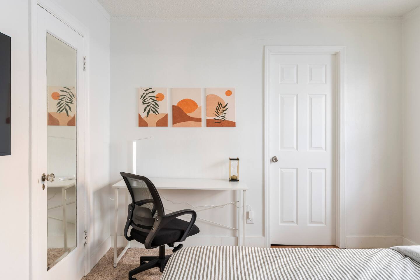 This light-filled room is spacious and stylish. Simple decor with a desk, private bathroom and comfy bed. Each private room has its own lock.
