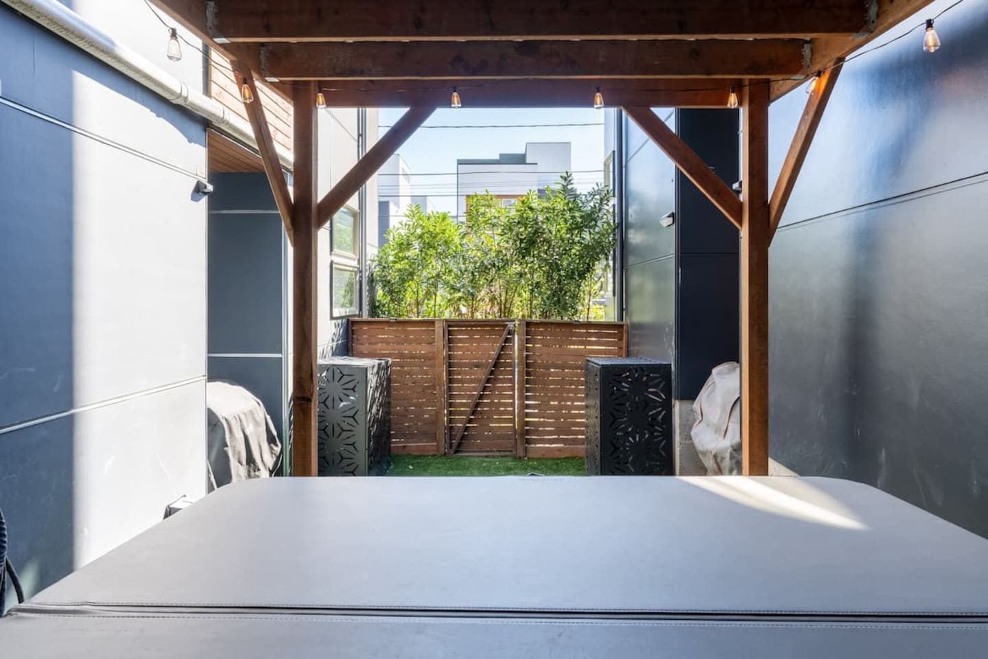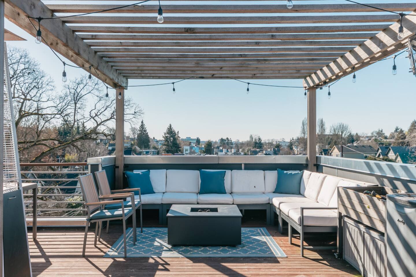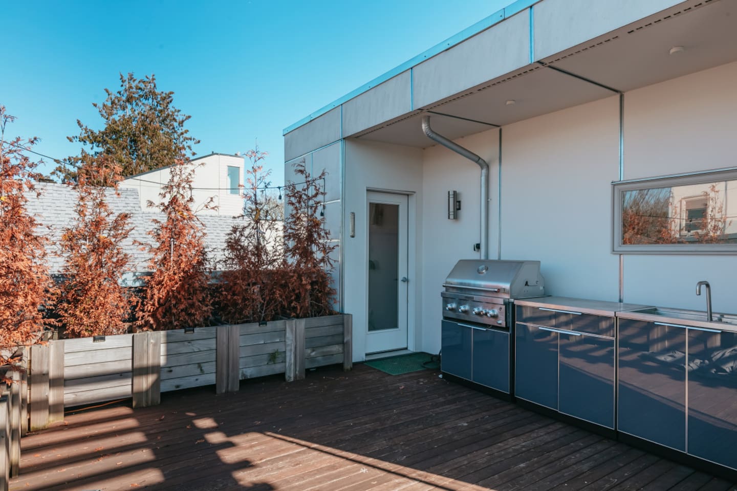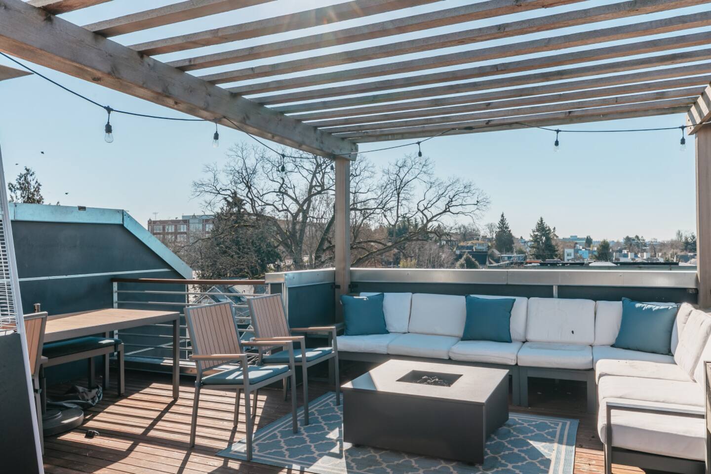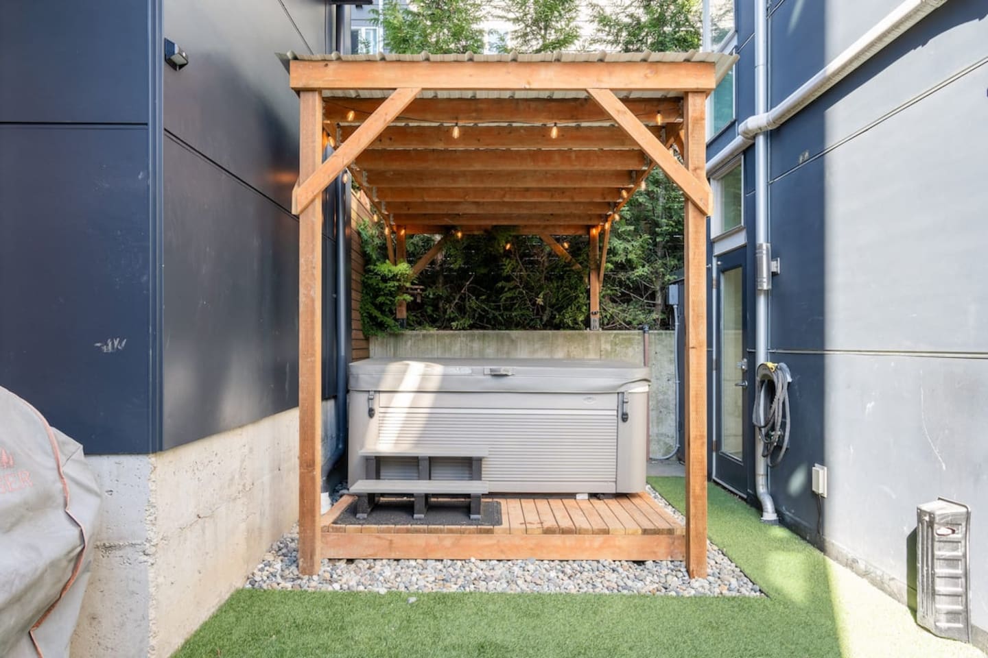 Entertain guests on the rooftop lounge or enjoy a soak in the hot tub or our rooftop sauna! Our 3-bedroom townhome is spacious and inviting, with plenty of natural light throughout. The living room is perfect for gathering with friends, with comfortable seating and a smart TV. The kitchen has plenty of counter space for preparing meals. And for a taste of the outdoors, you can step out onto the balcony and take in the sights and sounds of the city. Our home is the perfect home-away-from-home for your next visit. We look forward to hosting you!