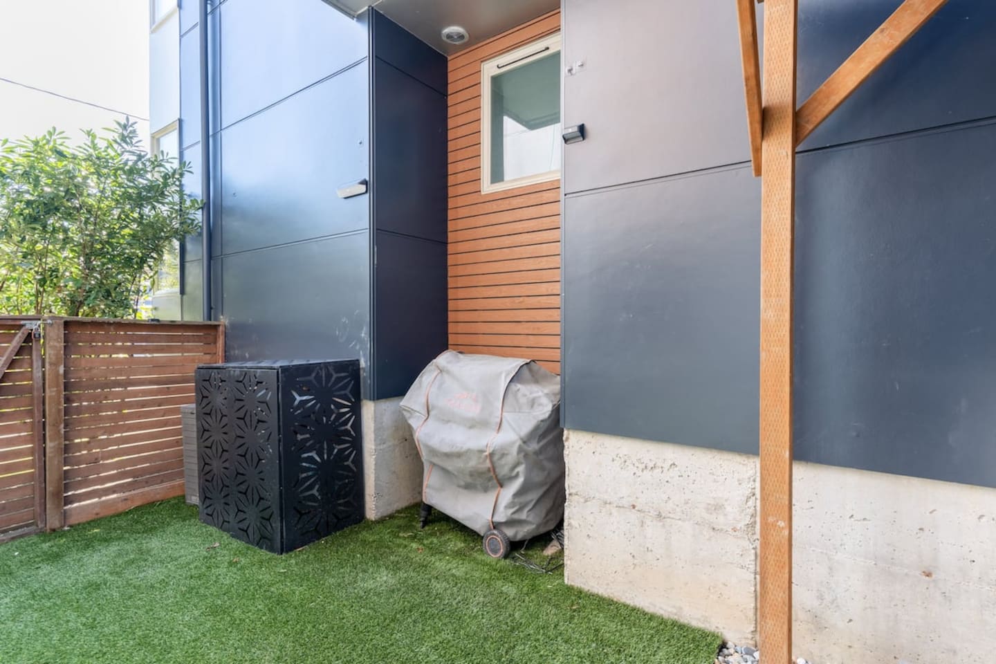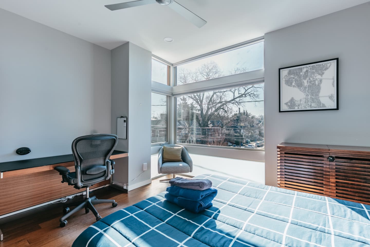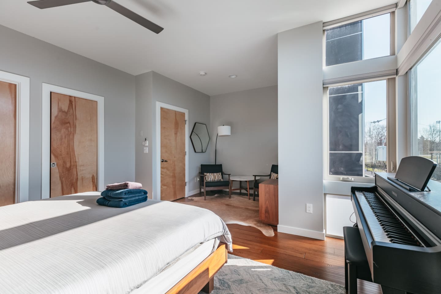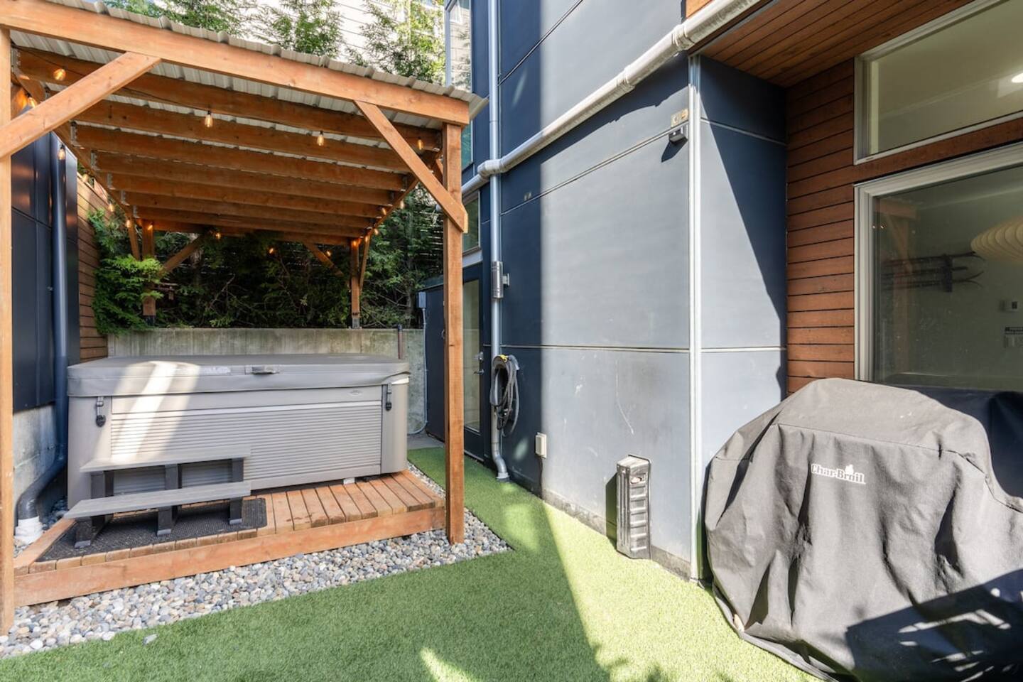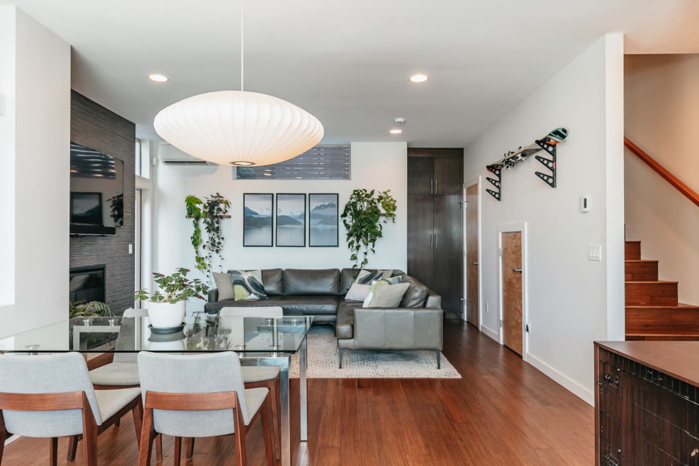 Entertain guests on the rooftop lounge or enjoy a soak in the hot tub or our rooftop sauna! Our 3-bedroom townhome is spacious and inviting, with plenty of natural light throughout. The living room is perfect for gathering with friends, with comfortable seating and a smart TV. The kitchen has plenty of counter space for preparing meals. And for a taste of the outdoors, you can step out onto the balcony and take in the sights and sounds of the city. Our home is the perfect home-away-from-home for your next visit. We look forward to hosting you!