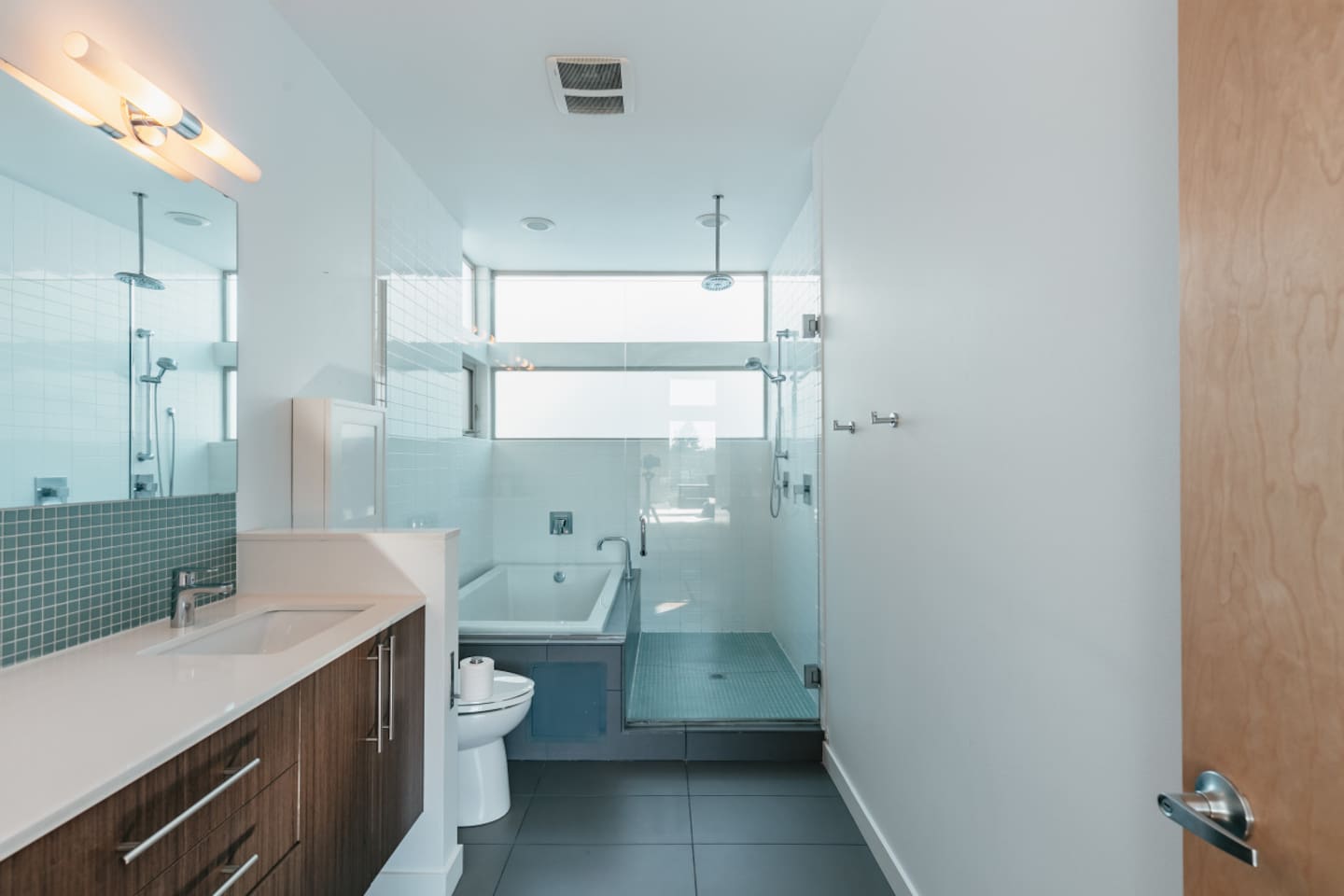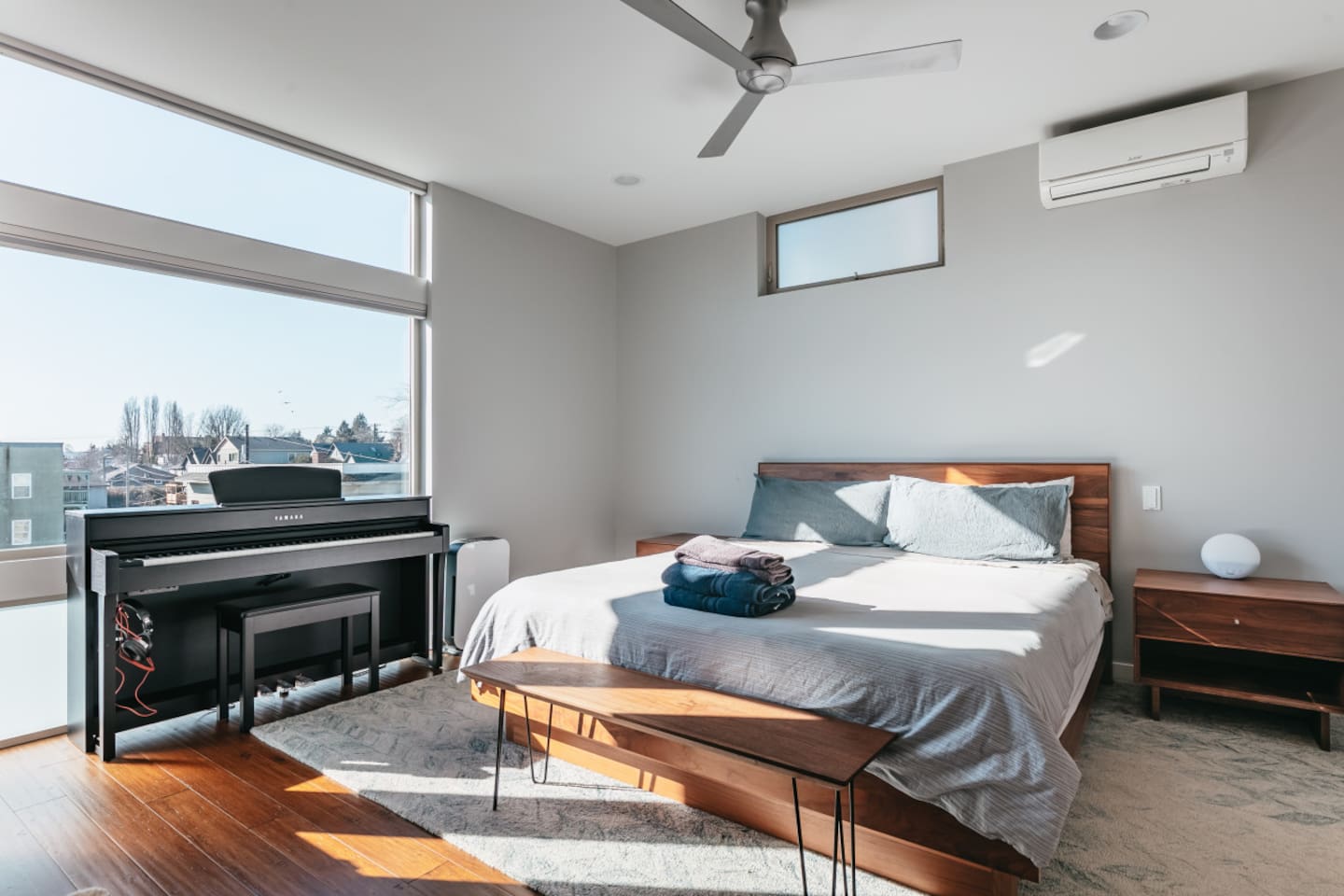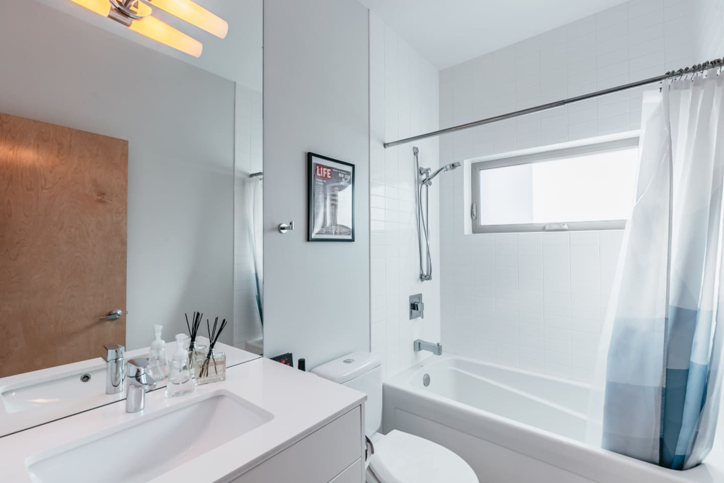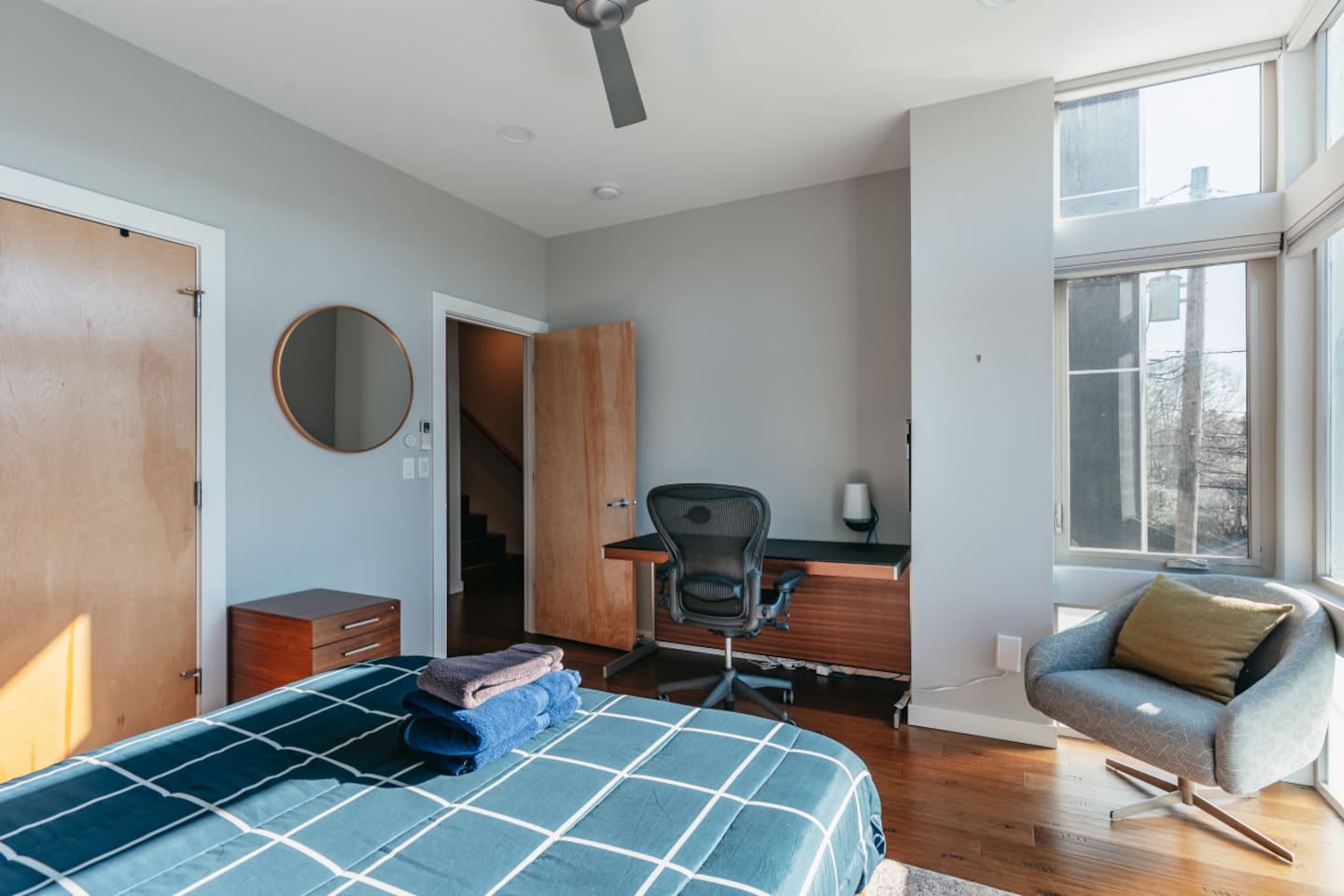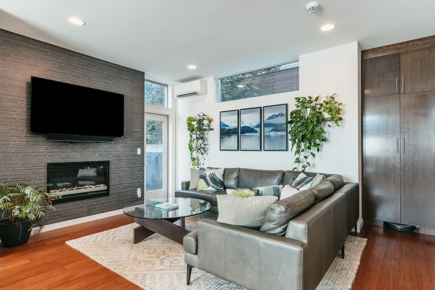 Entertain guests on the rooftop lounge or enjoy a soak in the hot tub or our rooftop sauna! Our 3-bedroom townhome is spacious and inviting, with plenty of natural light throughout. The living room is perfect for gathering with friends, with comfortable seating and a smart TV. The kitchen has plenty of counter space for preparing meals. And for a taste of the outdoors, you can step out onto the balcony and take in the sights and sounds of the city. Our home is the perfect home-away-from-home for your next visit. We look forward to hosting you!