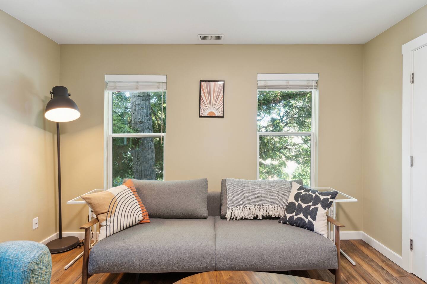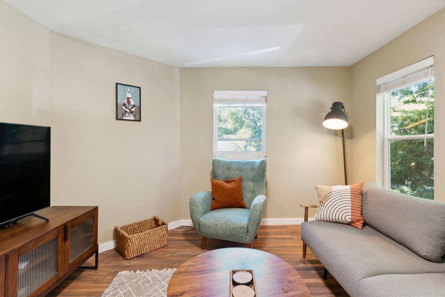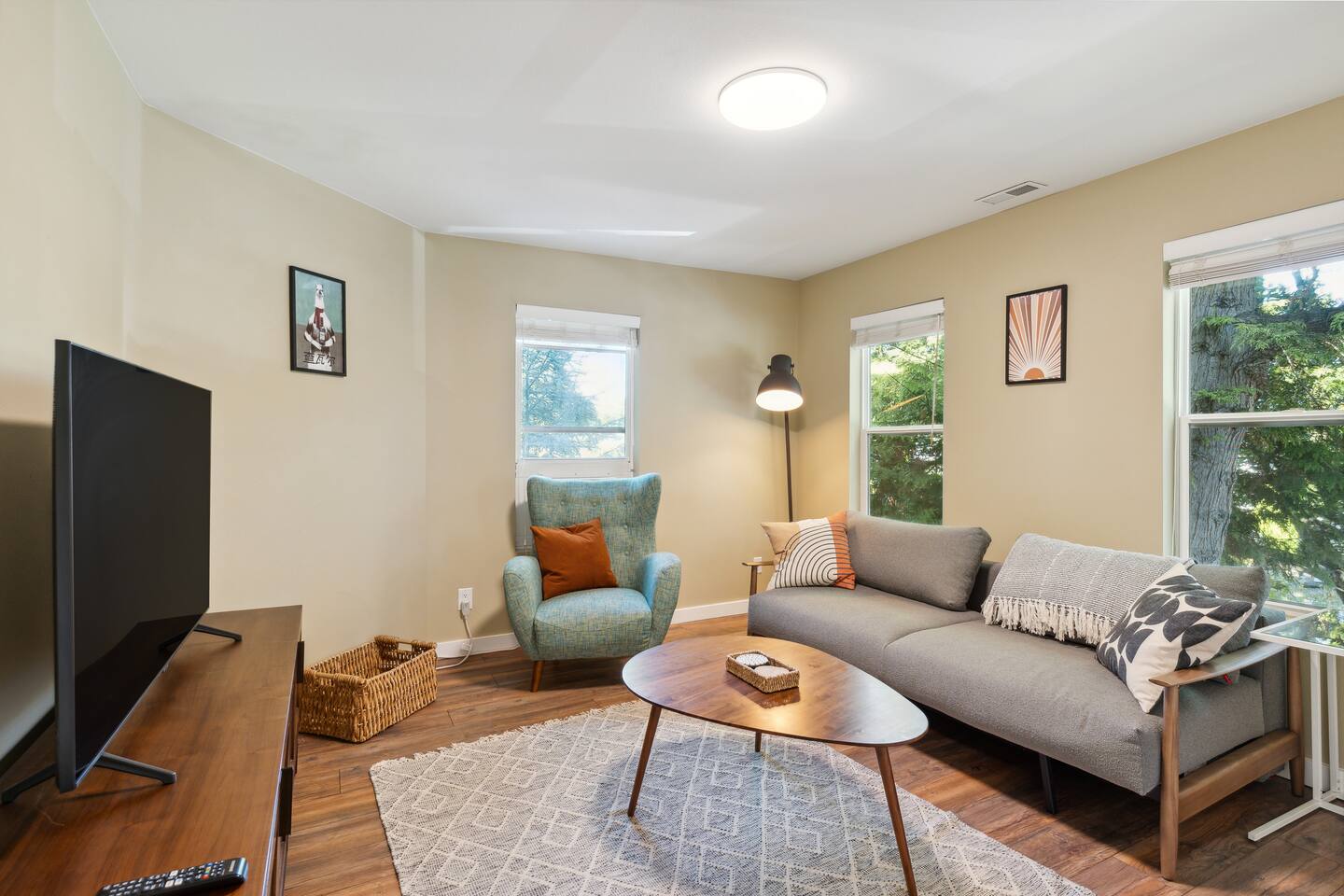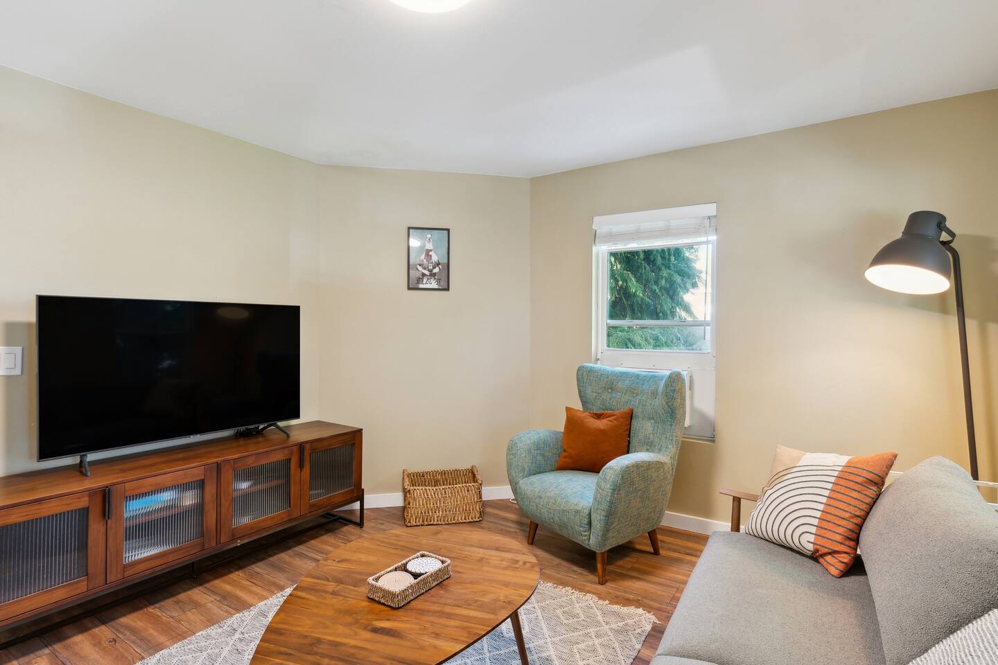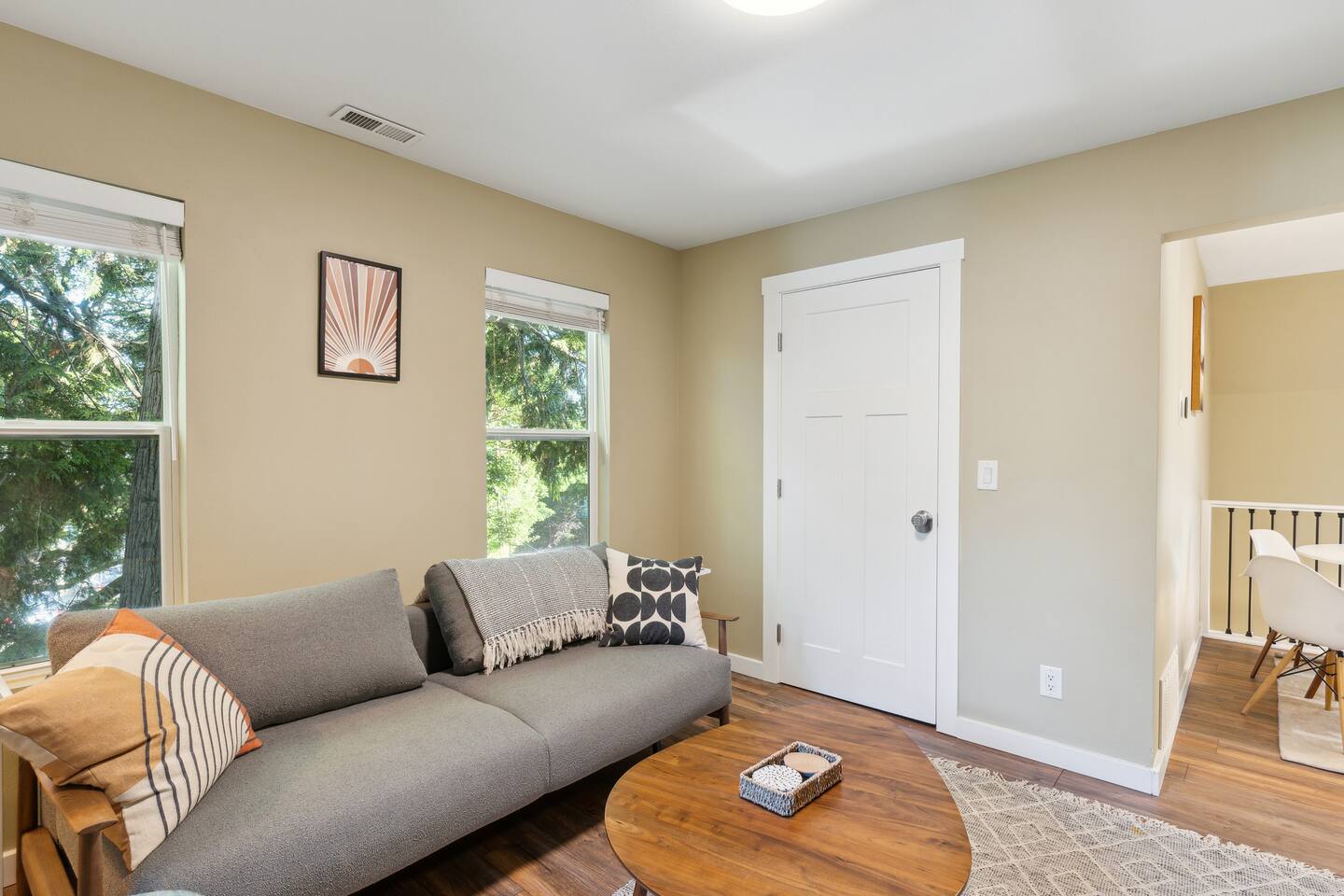 Experience all that the Central District has to offer while staying here at our Cheerful Duplex! Conveniently located just 10 minutes from downtown and within walking distance to so much of the excitement Seattle has to offer, this is the perfect place for your getaway! The 2BR/1BA unit is a serene setting nestled in a neighborhood that offers amazing amenities with everything your family needs! Inside the home, you'll have plenty of space to enjoy delicious meals, play board games, or enjoy the yard! Down the hallway, you'll find the bedrooms - one with a king sized Soft Beauty Rest mattress and the other with a queen-sized Medium Firm Beauty Rest mattress. The unit was recently updated and a stackable washer/dryer is available for use. The living room offers plenty of seating, a large Smart TV, games, and lots of natural light. The kitchen is fully equipped with items like a stand mixer, coffee maker, toaster, and cooking essentials... you will have everything you need but the ingredients! The backyard is shared between both units and features a small lawn, a hammock, and a 22” charcoal grill. The grill utensils are provided, and charcoal is available at the corner market. If you need more space, check availability for our 2nd listing “Charming Duplex: Downstairs”.