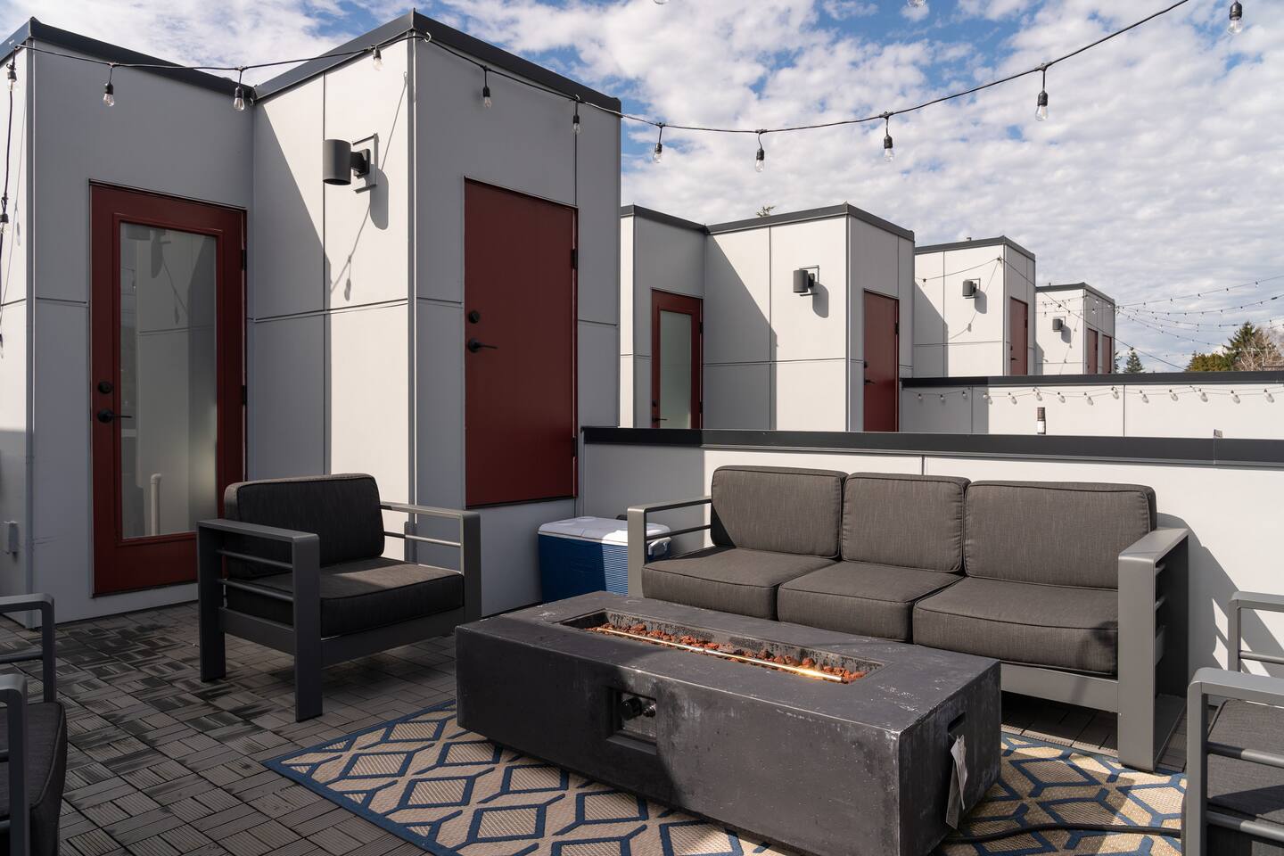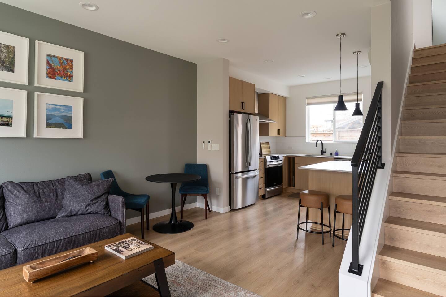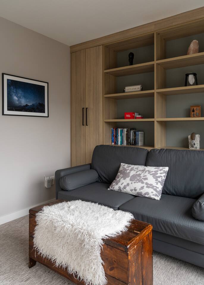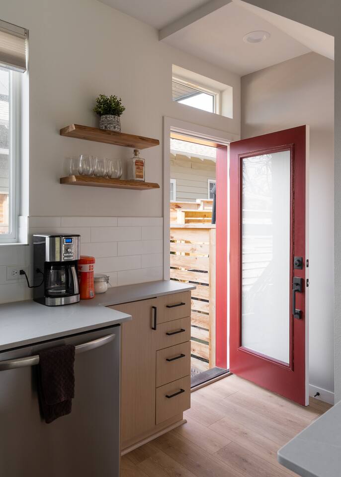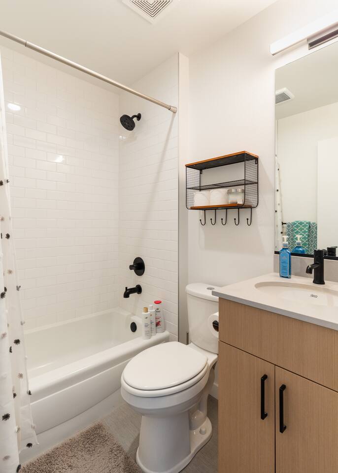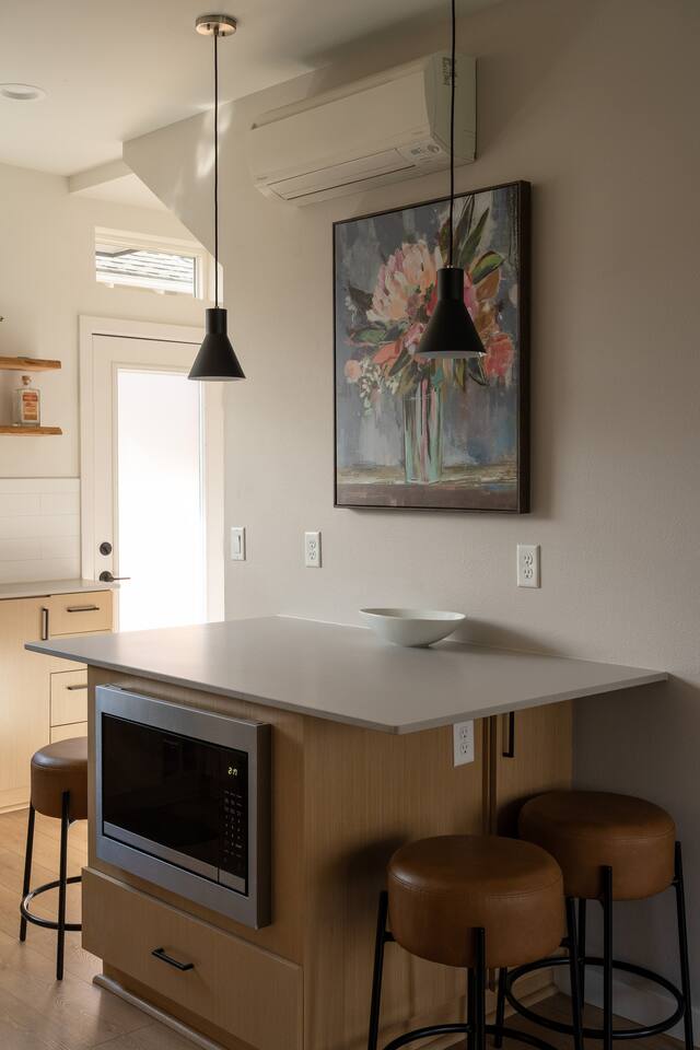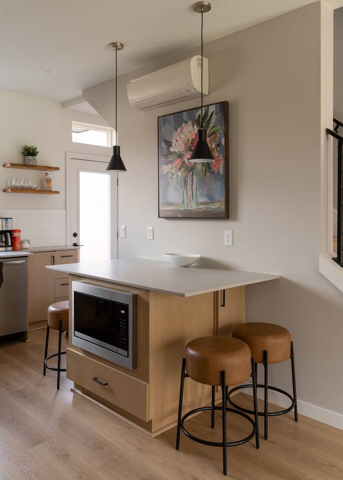Our new townhome is thoughtfully furnished and cozy. With a rooftop lounge & fire pit as well as a back patio there's plenty of space to hang out and entertain! *Fire pit - Propane tank included, but the guest is responsible for filling The master bedroom has a super comfy king bed, and the second bedroom has a nice queen-sized bed. Our modern kitchen has all the basics, and our living room has a very cozy sectional couch. We also have a "flex" space with a sleeper sofa. *AC is a mini split located on the ground floor.