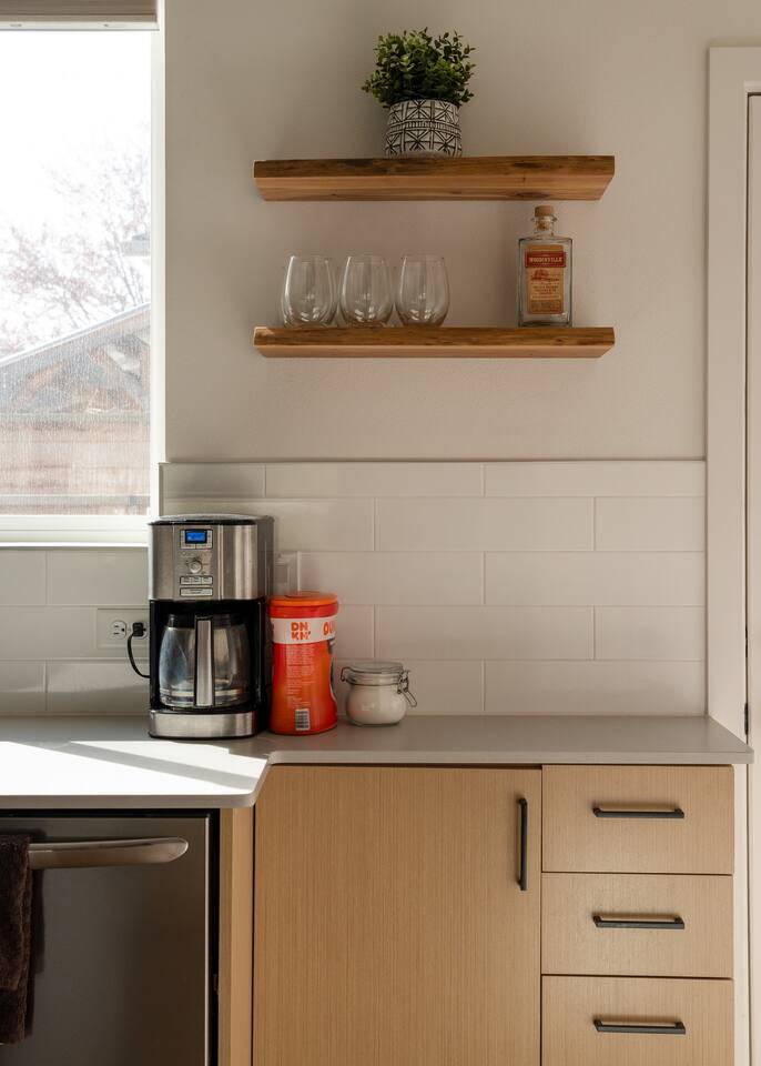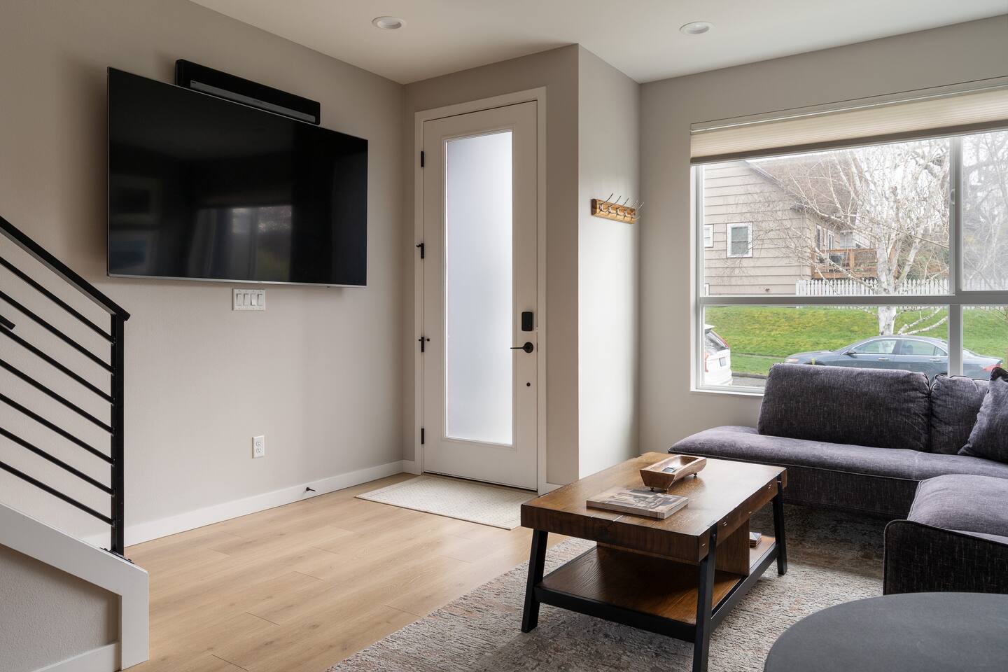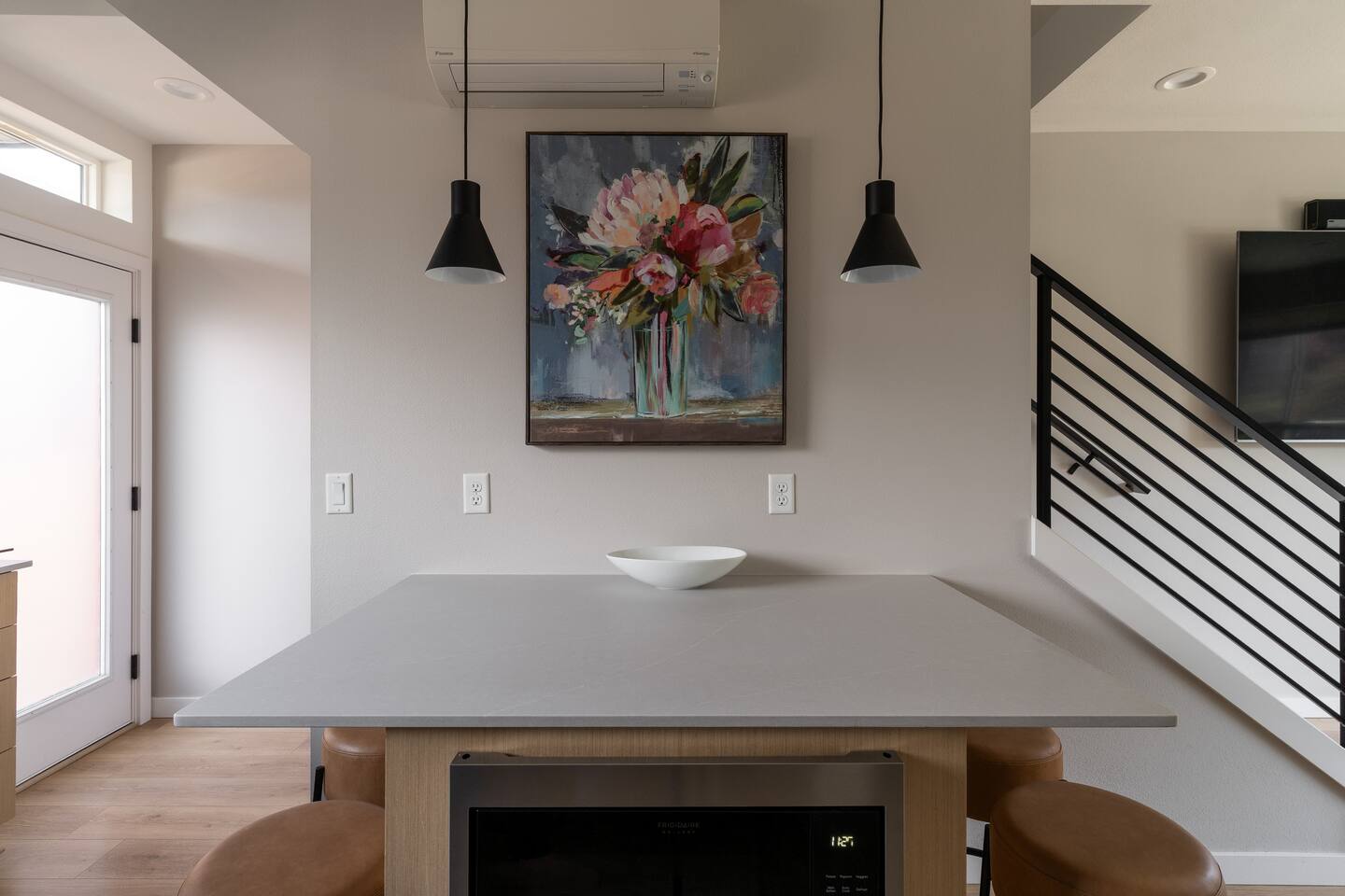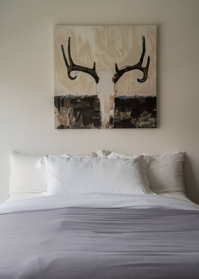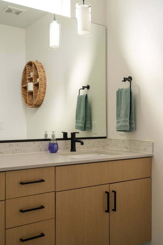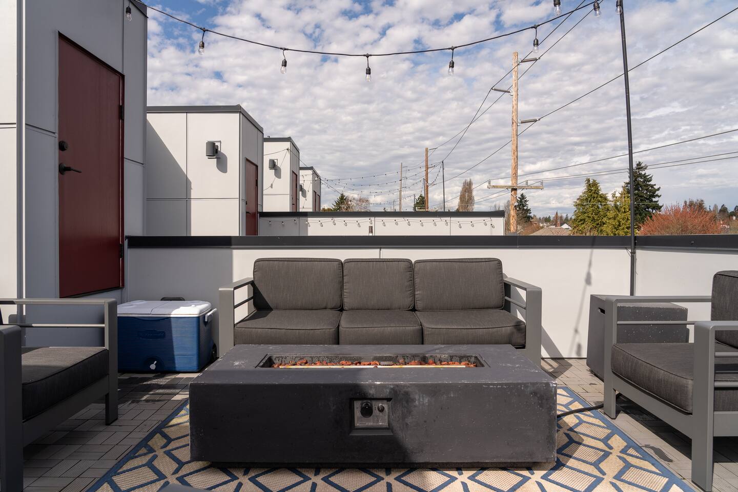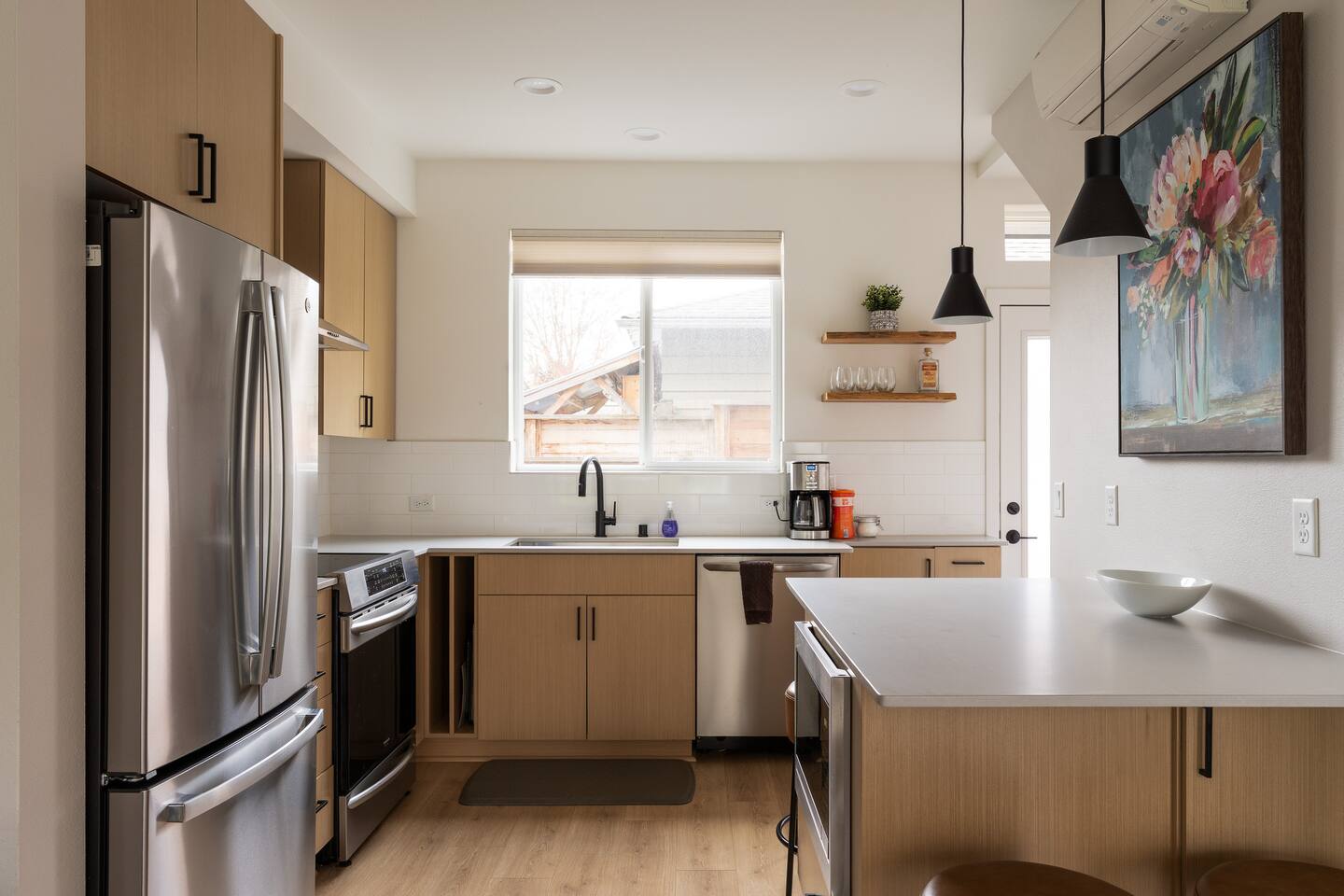 Our new townhome is thoughtfully furnished and cozy. With a rooftop lounge & fire pit as well as a back patio there's plenty of space to hang out and entertain! *Fire pit - Propane tank included, but the guest is responsible for filling The master bedroom has a super comfy king bed, and the second bedroom has a nice queen-sized bed. Our modern kitchen has all the basics, and our living room has a very cozy sectional couch. We also have a "flex" space with a sleeper sofa. *AC is a mini split located on the ground floor.