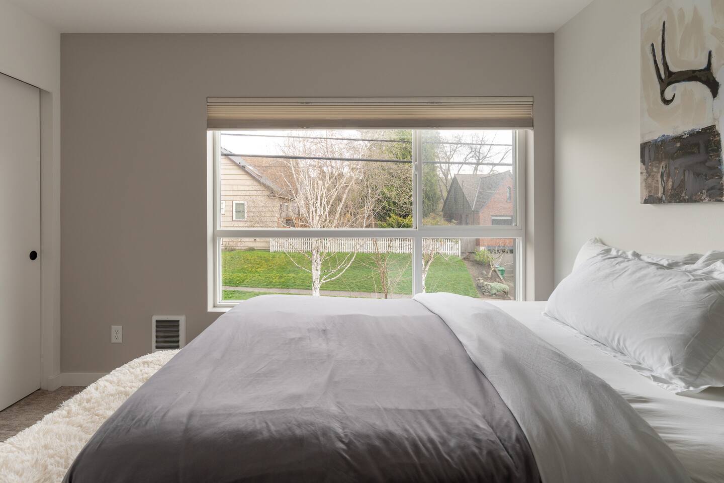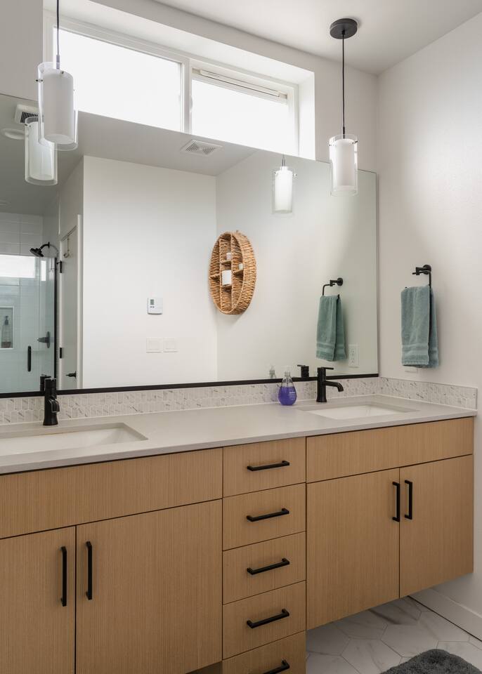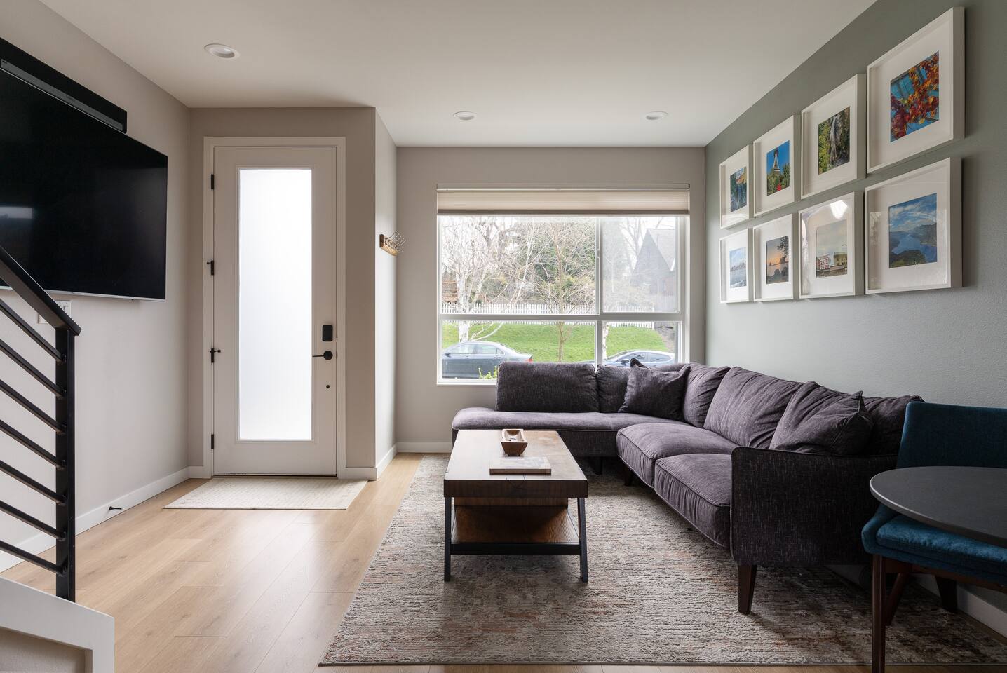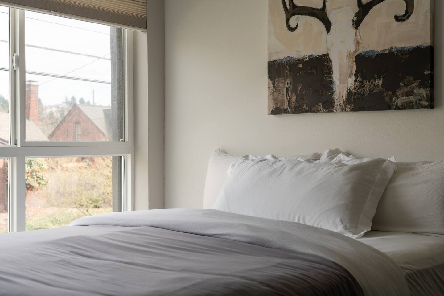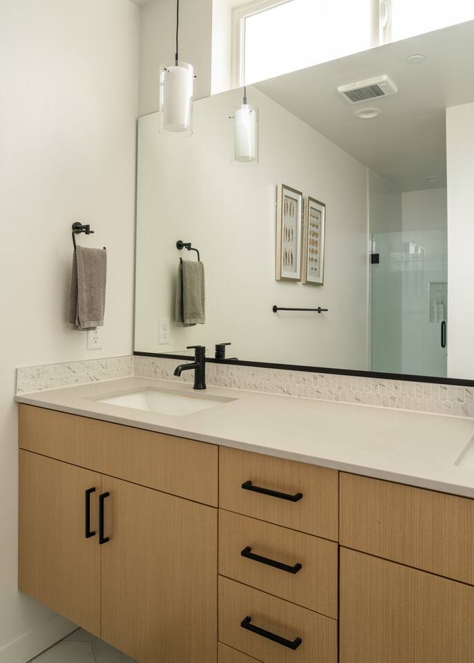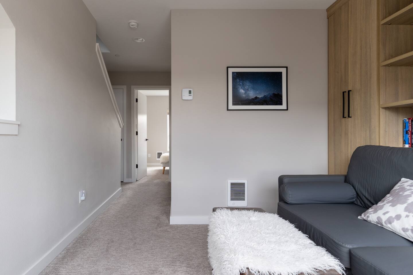 Our new townhome is thoughtfully furnished and cozy. With a rooftop lounge & fire pit as well as a back patio there's plenty of space to hang out and entertain! *Fire pit - Propane tank included, but the guest is responsible for filling The master bedroom has a super comfy king bed, and the second bedroom has a nice queen-sized bed. Our modern kitchen has all the basics, and our living room has a very cozy sectional couch. We also have a "flex" space with a sleeper sofa. *AC is a mini split located on the ground floor.