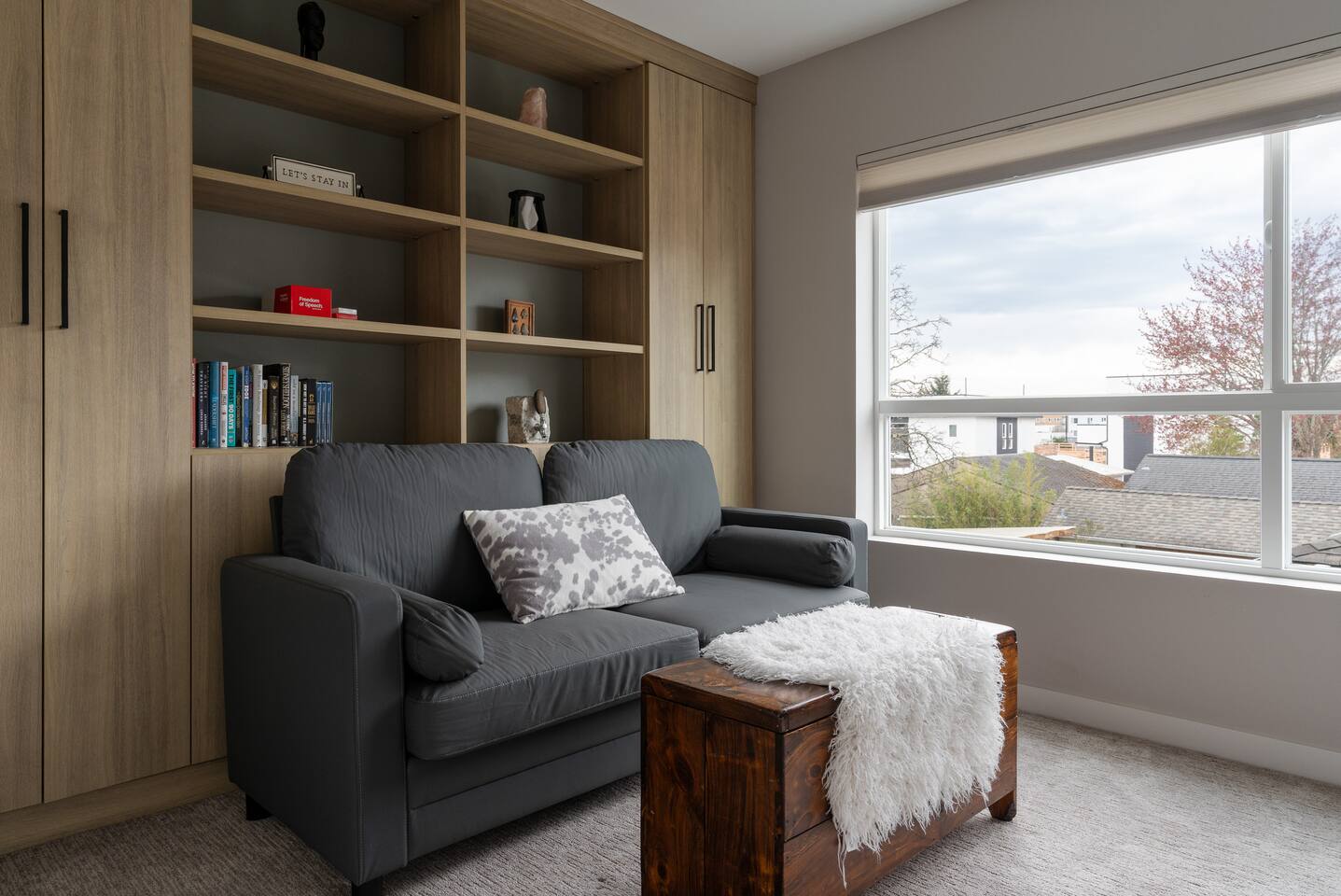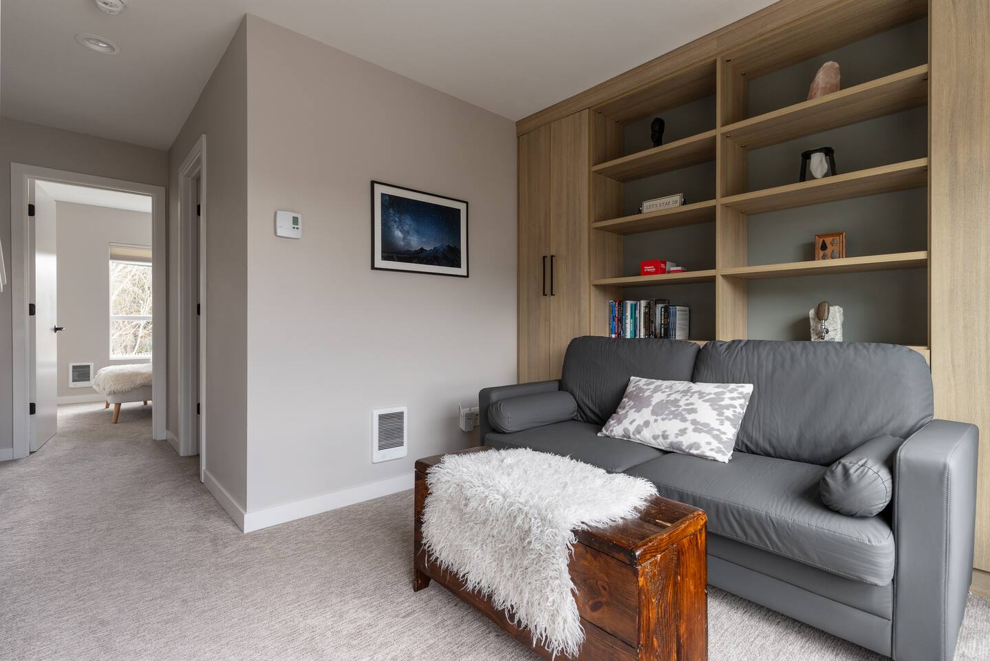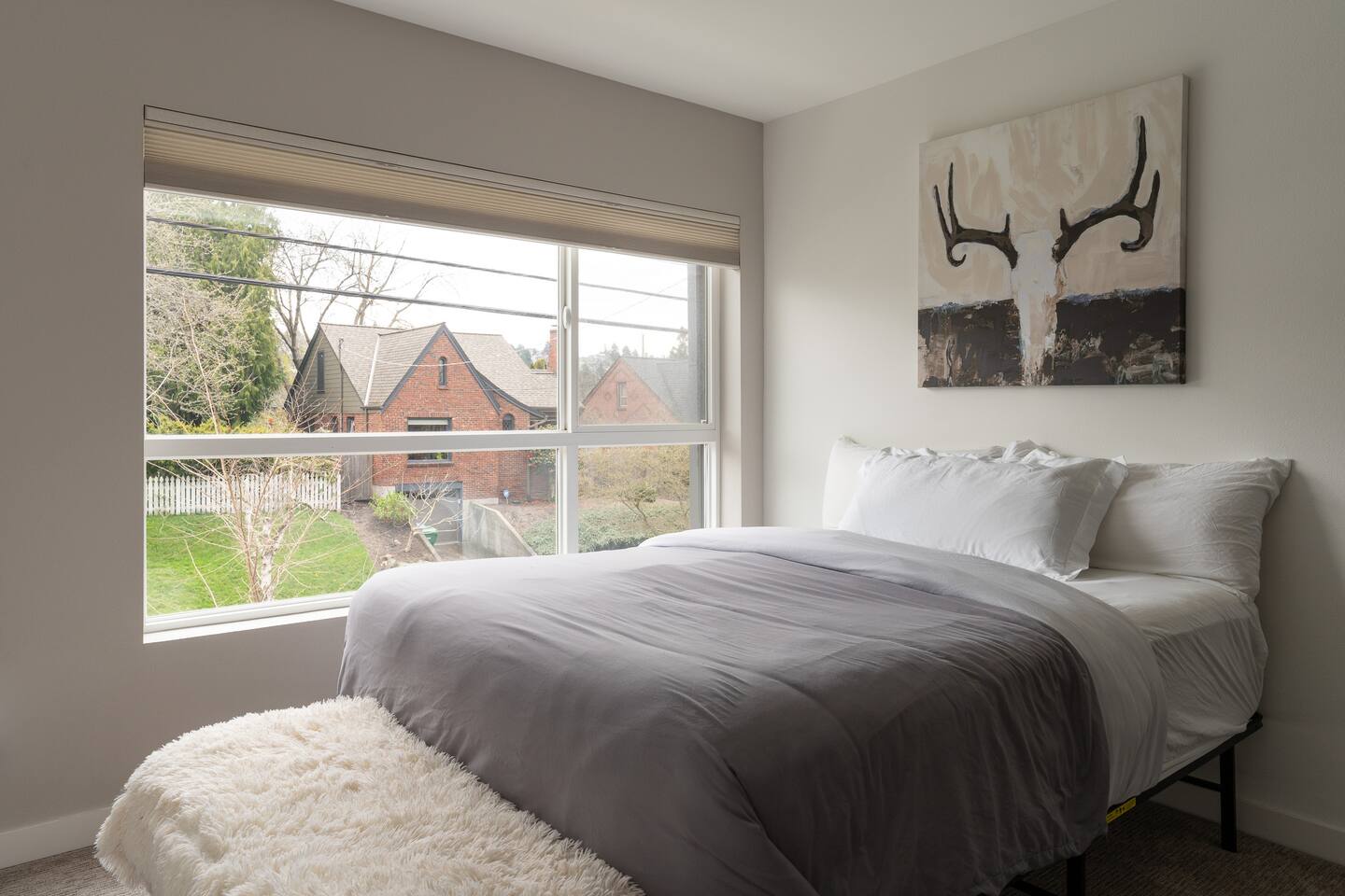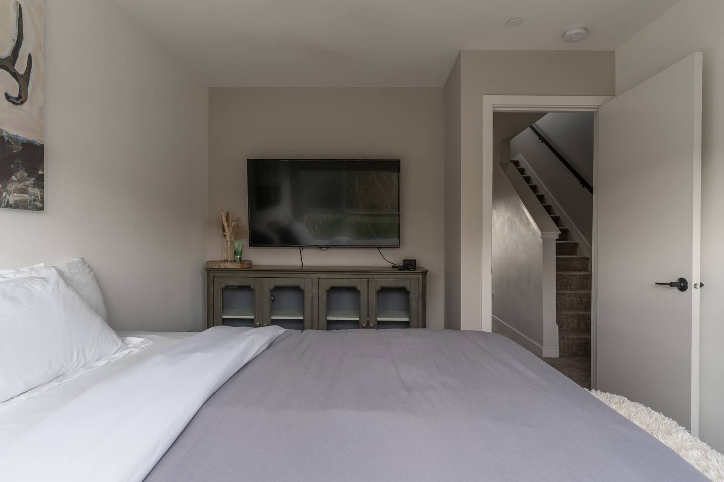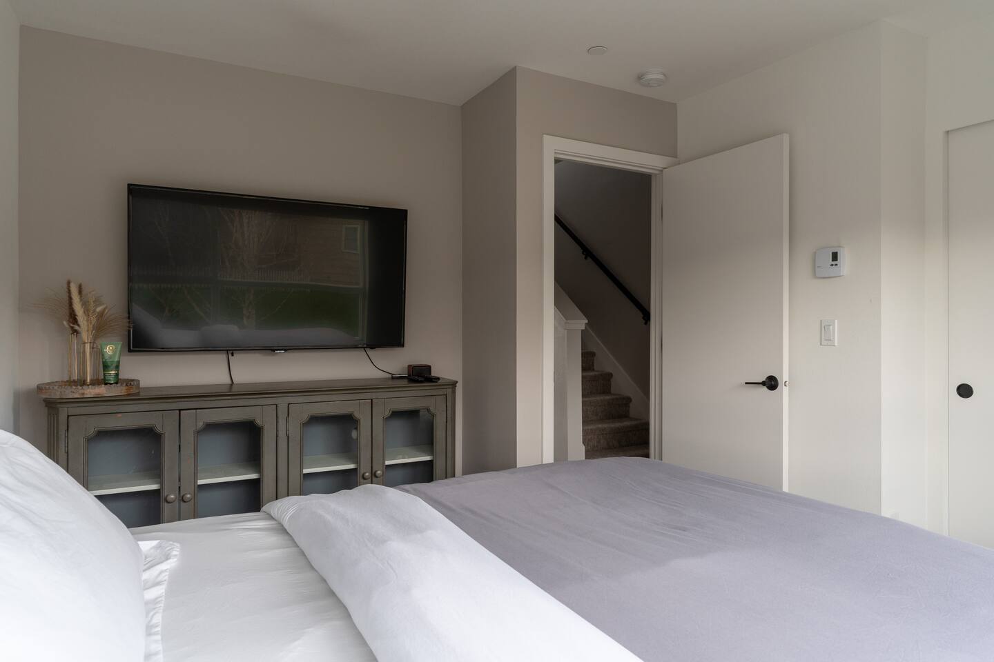 Our new townhome is thoughtfully furnished and cozy. With a rooftop lounge & fire pit as well as a back patio there's plenty of space to hang out and entertain! *Fire pit - Propane tank included, but the guest is responsible for filling The master bedroom has a super comfy king bed, and the second bedroom has a nice queen-sized bed. Our modern kitchen has all the basics, and our living room has a very cozy sectional couch. We also have a "flex" space with a sleeper sofa. *AC is a mini split located on the ground floor.