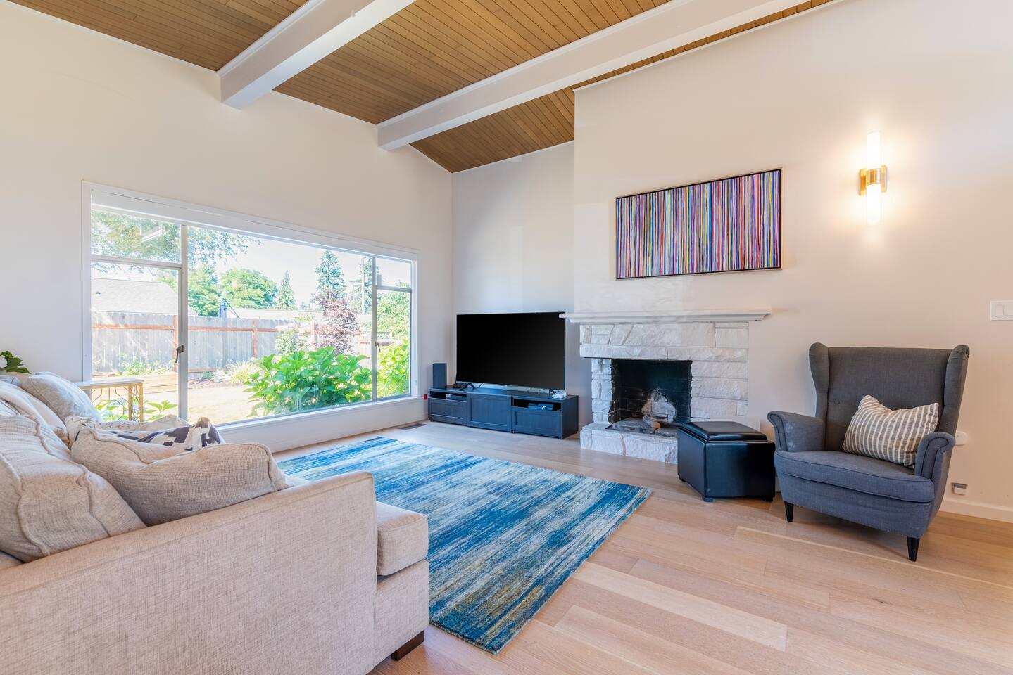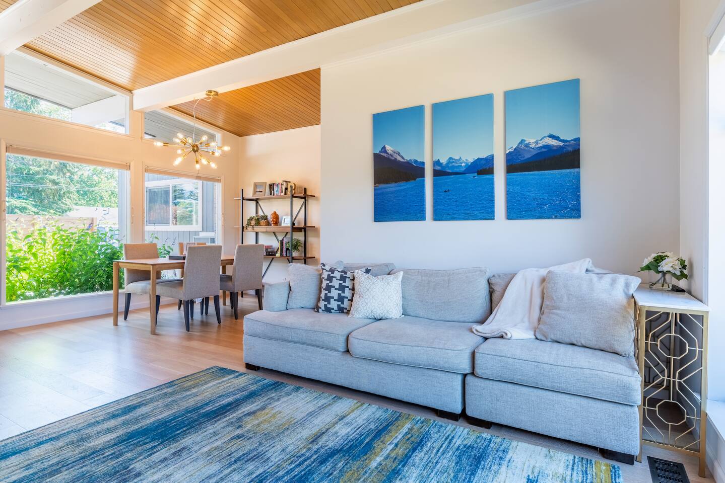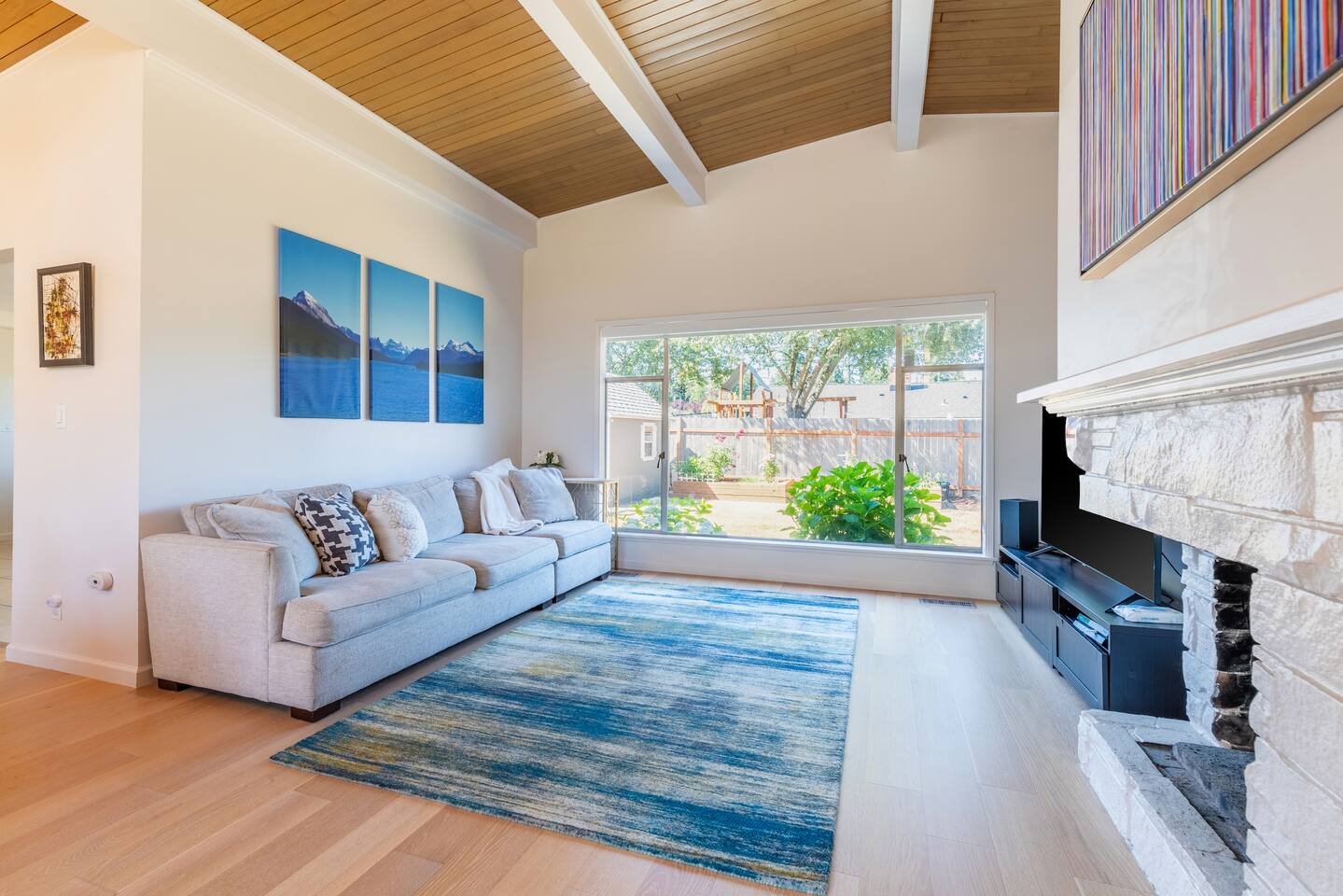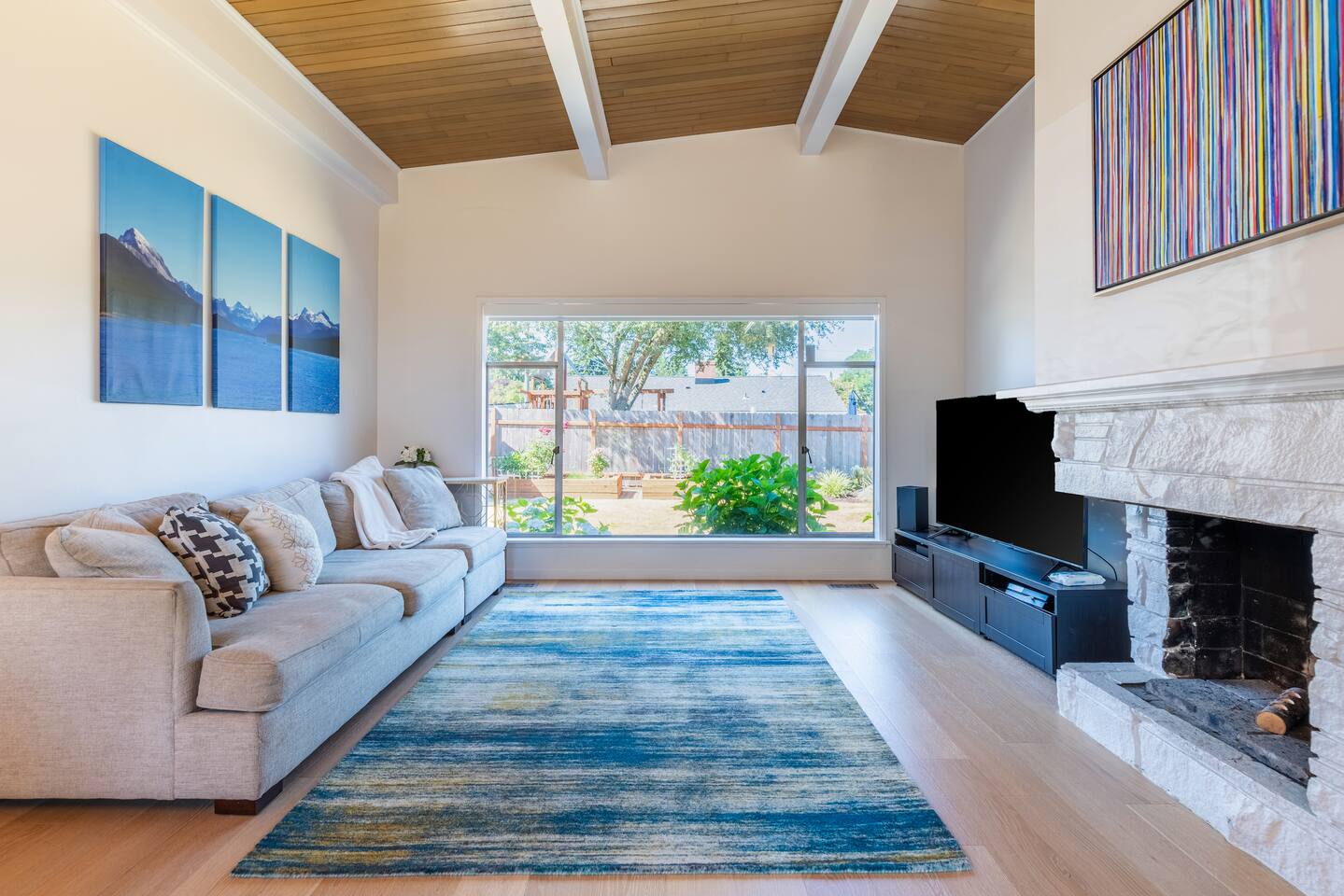 Charming Mid-Century Modern Single Story Home! This beautifully maintained property features a spacious and open floor plan. Expansive living area with vaulted ceilings and enormous windows, which flood the space with natural light and makes the outdoors feel close at hand. Situated in a picturesque setting and conveniently located near numerous amenities, this home is a perfect blend of comfort and style.